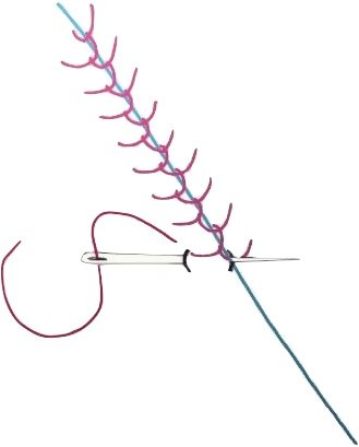 Firstly mark the central line to work down. Secure your thread at the top of the marked line. Take a diagonal stitch approximately 1cm back into the marked line, allowing the stitch to stay slightly slack. Pass the needle over the working thread when pulling through to form the feather stitch. Repeat on the opposite side of the marked line a little further down.